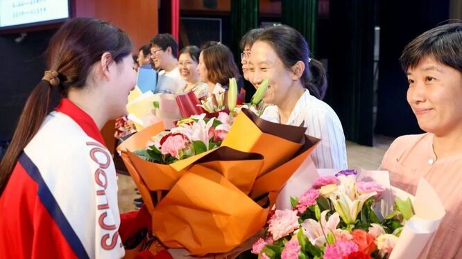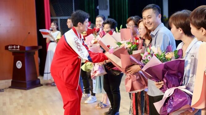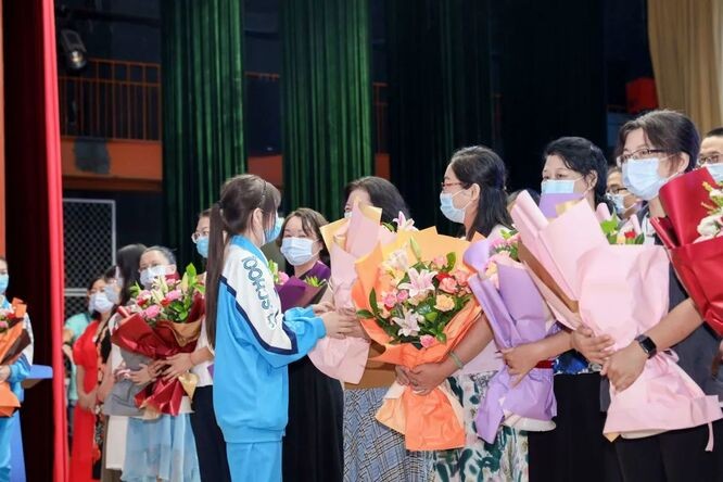 学生代表为老师们献上了鲜花,致敬为同学们争分夺秒、精心备课、悉心答疑、夜夜挑灯批改作业的老师们。学生和老师紧紧相拥,传递着彼此最真诚的祝福。
